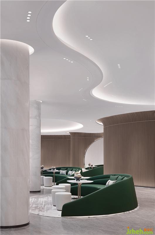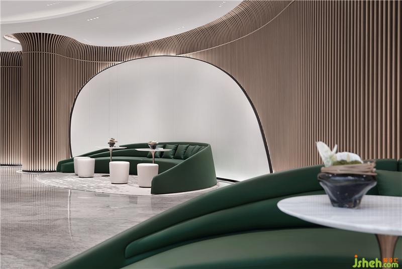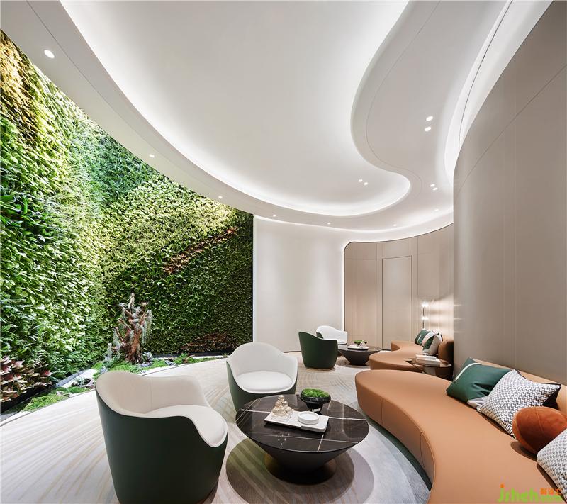 延續(xù)“穿谷溪岸”的靈動基調(diào),空間環(huán)抱式的綠植墻引入室內(nèi),不僅是形式的陳設美感,更多的是通過視覺美表達它與整體空間的線條。