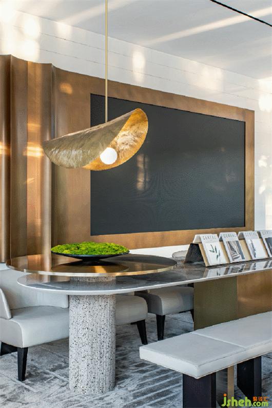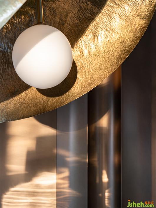 蘊(yùn)意波光漣漪的黃銅造型屏風(fēng),隨著日光蕩漾,如置身湖畔中央,和文人雅士賞碧波而觀魚(yú)戲,一寸一隅中感悟空間肌理帶來(lái)淡然的心境啟示。