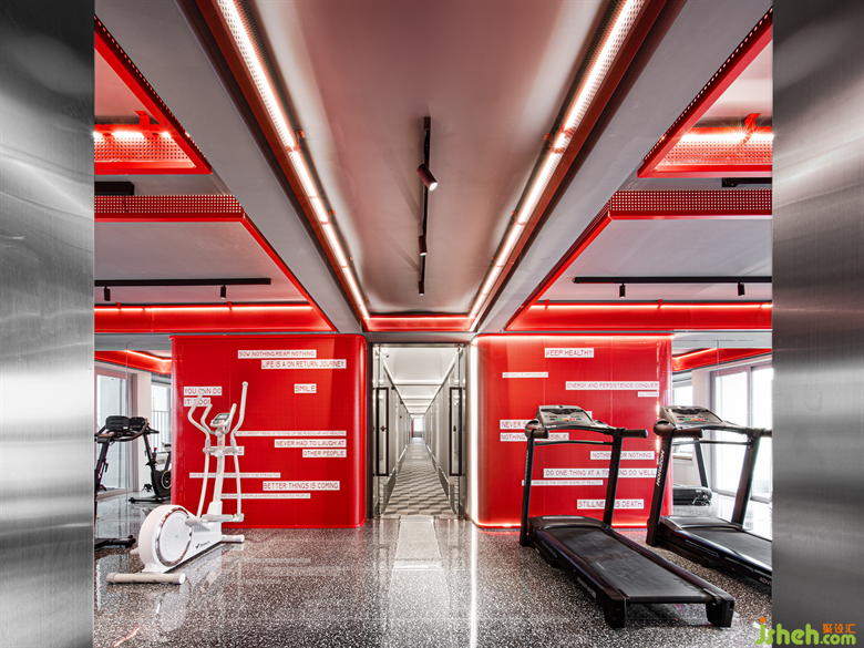 健身空間使用紅、黑的經(jīng)典搭配,以視覺沖擊和空間感取勝。奧迅摒棄一切繁瑣與浮夸的裝飾,樣板房設(shè)計將復(fù)雜性統(tǒng)一在各種直線中,營造豐富而細(xì)密的情感維系,使人們從抽象的視覺中感受未來生活的同時,在彼此交流運動心得,回歸本真狀態(tài)下生活的豐盈。