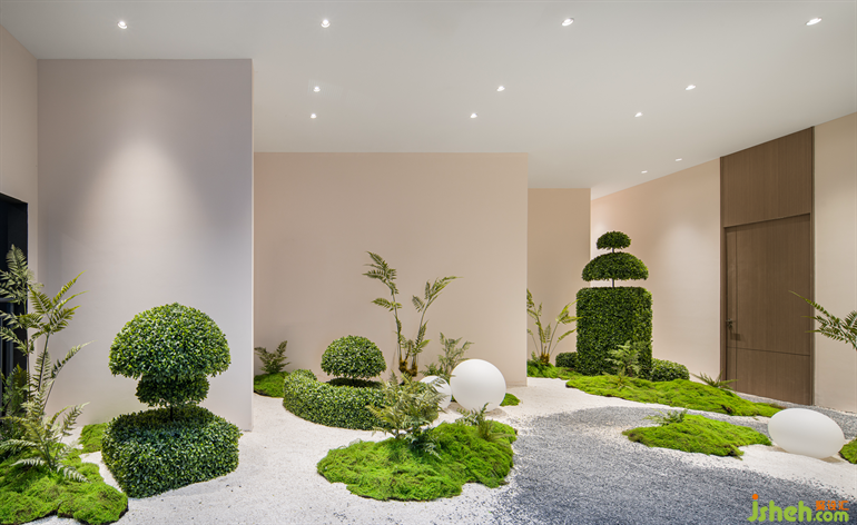 植入綠意環(huán)繞的過廳,是“尋園記”中給來訪者的一席流動春意。售樓部設(shè)計在方寸間駐足、觀賞、游玩,一處寧靜之地能瞬間撫平那顆浮躁的心。