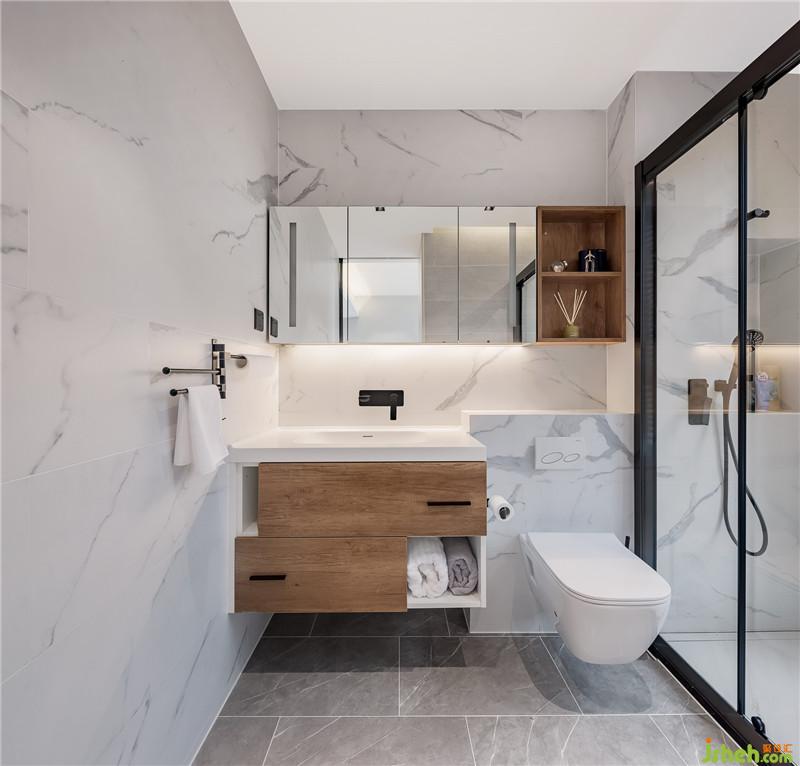 在黑色滑動門背后是一個(gè)純凈的客衛(wèi),材質(zhì)的選用,是對于原始形態(tài)的推崇,加上精密打磨,表現(xiàn)出冷靜、光滑的獨(dú)特肌理,看似冰涼,卻極易牽動情思。值得一提的是,整個(gè)空間并沒有單獨(dú)設(shè)置公共衛(wèi)生間,而是將兩間臥室都當(dāng)做套房處理,一方面是對客人的溫柔關(guān)照,另一方面,是向往自由隨性、與萬物和諧共處的生活映照。