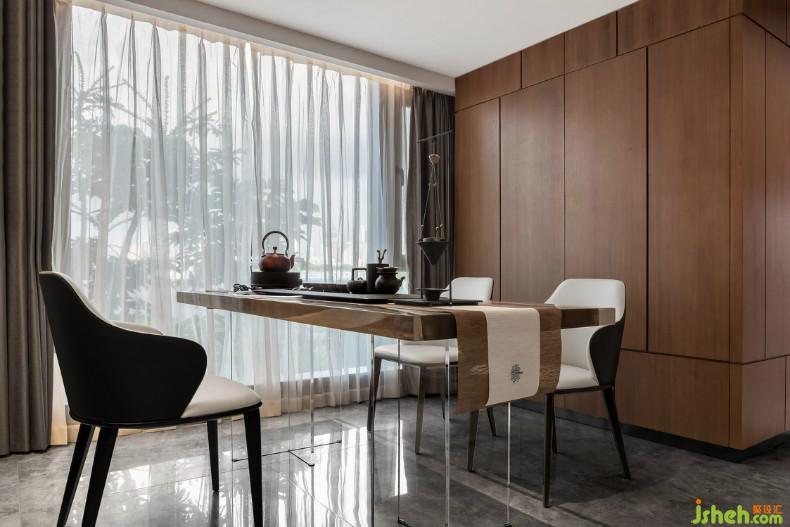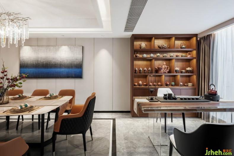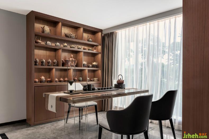 空間劃分過(guò)程中,各功能區(qū)呈遞進(jìn)式布局。開(kāi)放式客廳、餐廳、茶室、休閑區(qū)、吧臺(tái)都被容納到同一個(gè)生活場(chǎng)景;室內(nèi)設(shè)計(jì)師以及利用木墻隔斷將茶室、休閑區(qū)間隔開(kāi),視覺(jué)上形成“一室多用,互不干擾”的效果,同時(shí)維系各個(gè)功能區(qū)域的秩序,增強(qiáng)空間層次感。