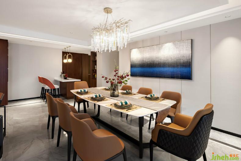 餐廳設(shè)計(jì)為避免視覺(jué)雜亂,只保留了清晰素凈的元素。室內(nèi)設(shè)計(jì)師藝術(shù)燈飾與背景墻畫(huà)在簡(jiǎn)約氣質(zhì)下,給人寧?kù)o安逸的質(zhì)感。