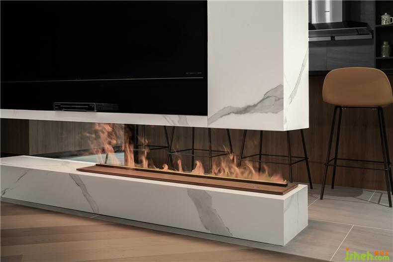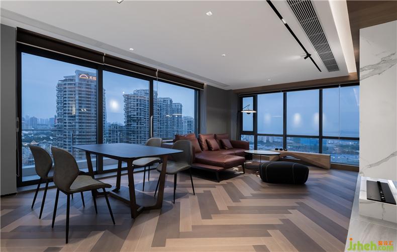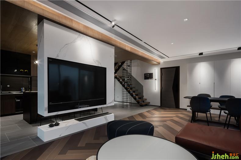 一層主要集中在對(duì)開放式公共區(qū)域的空間布置規(guī)劃,室內(nèi)設(shè)計(jì)師并利用原木色與白色,將餐廳與客廳通過上下色感與紋理反差,半隔斷式大理石電視背景墻區(qū)分開。180°落地窗讓城市景觀與晝夜之間變幻的自然光線落入屋內(nèi),讓人享受在大城市里愜意、輕慢、舒暖的生活節(jié)奏。