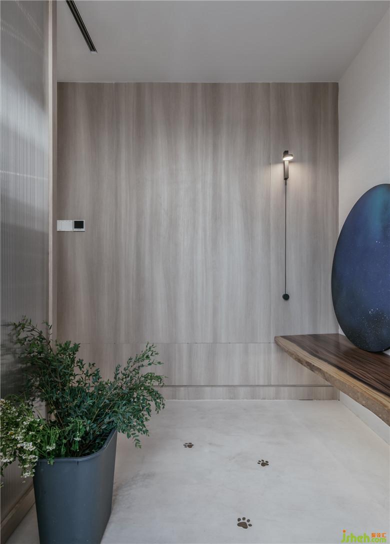 步入大門,長虹玻璃移門隱去了視線,低頭專心換鞋便可發(fā)現(xiàn)這一串可愛的貓爪印,這是屬于一家人的印記,也創(chuàng)造了行走于此 獨特的感知體驗。
