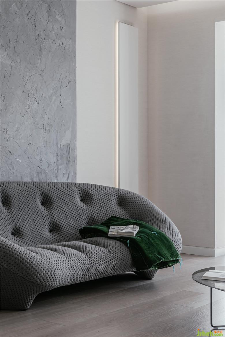 思考的空間對于擁擠的城市來說,是一種居住選擇。白色、灰色、木色和綠色,一切都是淡淡的,沒有其他多余的色彩與裝飾。背景墻、氛圍燈光和沙發(fā)紋理一起呈現(xiàn)出立體化的視覺思維。