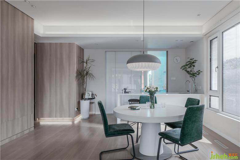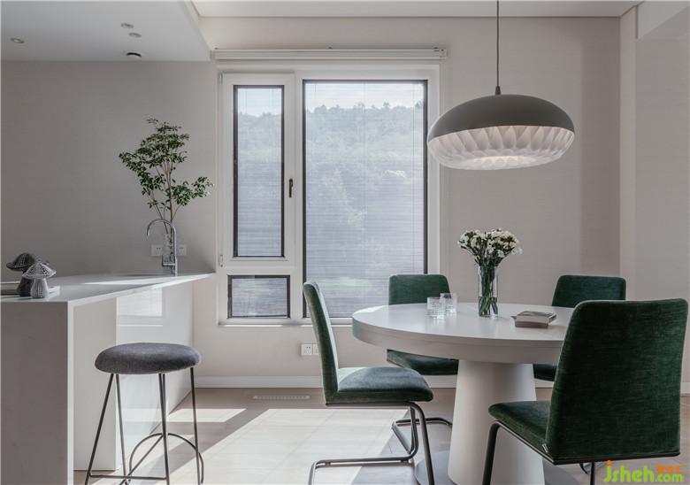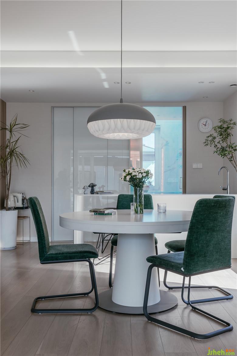 餐廳是綠色清新色調(diào),簡單的花木替代繁復(fù)華麗的插花,素樸中由近及遠(yuǎn)地透著點(diǎn)點(diǎn)層次,呈現(xiàn)安靜自然的詩意。一盞別致的吊燈呼應(yīng)圓桌,提升空間關(guān)系變得愈加飽滿。