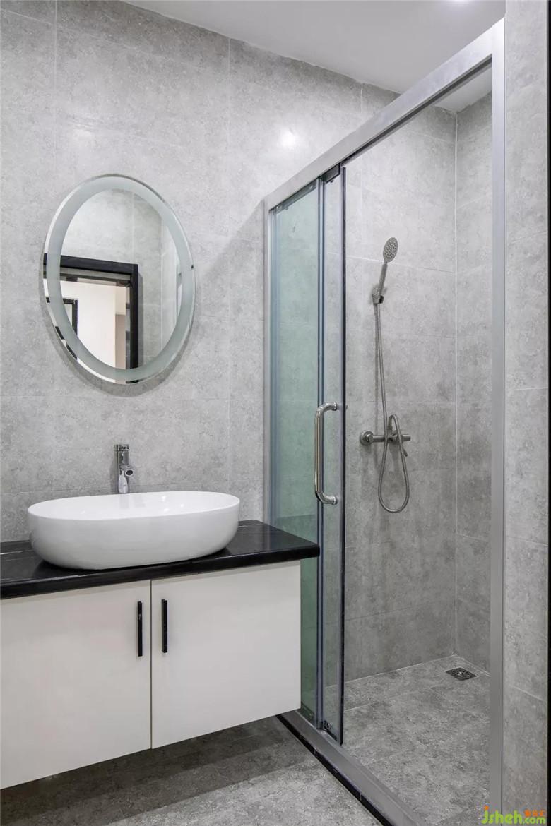 墻面與地面采用統(tǒng)壹地磚,在視覺上延伸了作用,減少了空間局促感。定制收納柜子,更好的貼合空間需求,而且上不到頂+下不到地的設(shè)計,不僅是為了美觀考慮,更多的還是為了減少擁擠感。