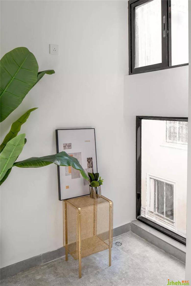 陽臺因梁不能將外墻完全砸掉,設(shè)計師便在梁的上下開了兩個窗戶,終于讓房子有了標(biāo)配的生活陽臺;滿足了原本沒有陽臺的房子有了既富有設(shè)計感又增加了室內(nèi)采光。簡單的白色墻面在視覺上增大了空間面積。