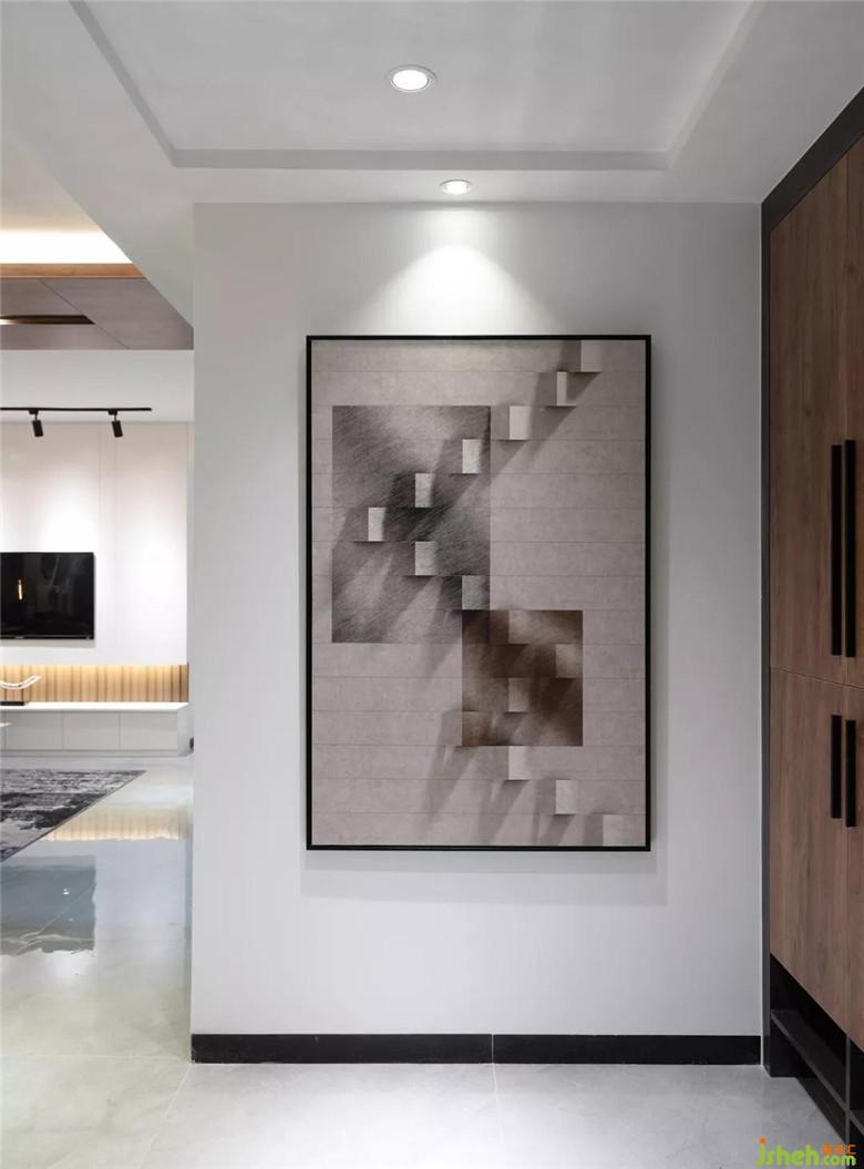 入門處的玄關氣質典雅,抽象的掛畫在3㎡的空間里,氣韻低調奢華;原先的玄關鞋柜設計老舊,改造后的玄關增加1586mm定制柜,柜面的木頭紋理,樸實而細膩,柜子不但沒有遵循常規(guī)鞋柜設計,還結合生活行為設置方便穿鞋的地方。裝修設計