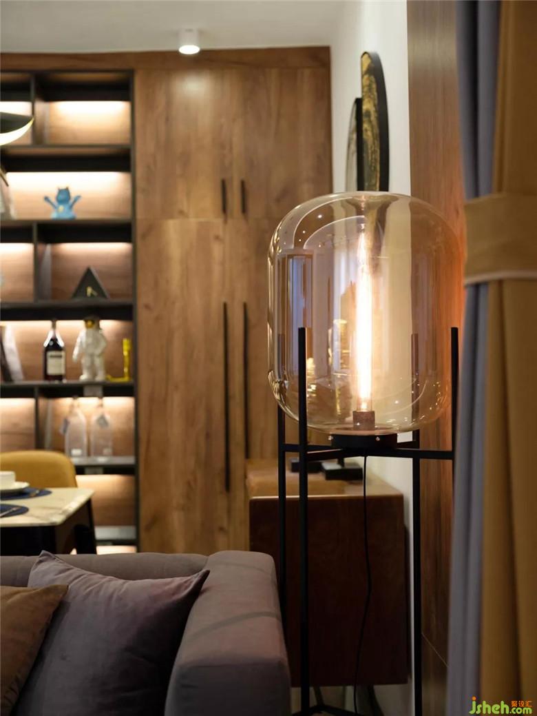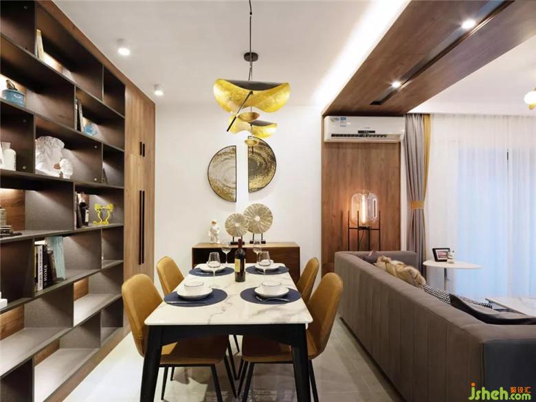 餐廳和客廳在同一空間,卻不顯突兀。客廳與餐廳天花中間的木質吊頂,讓客餐廳功能區(qū)分更加清晰。餐桌上方的燈是業(yè)主淘回來的復古吊燈,金屬的銅片,暖黃的燈光,是一份歸家的安心。設計師新設計了木質紋理的置物架,打造充滿質感的落地書架,可以放置書籍和業(yè)主從世界各地淘回來的展示品。裝修設計