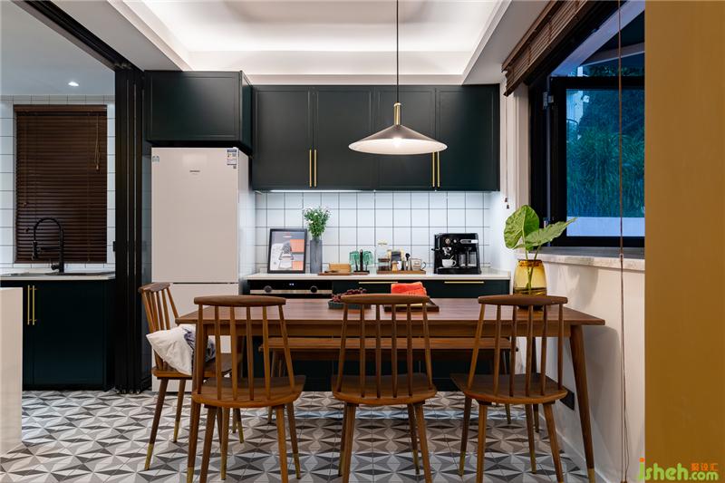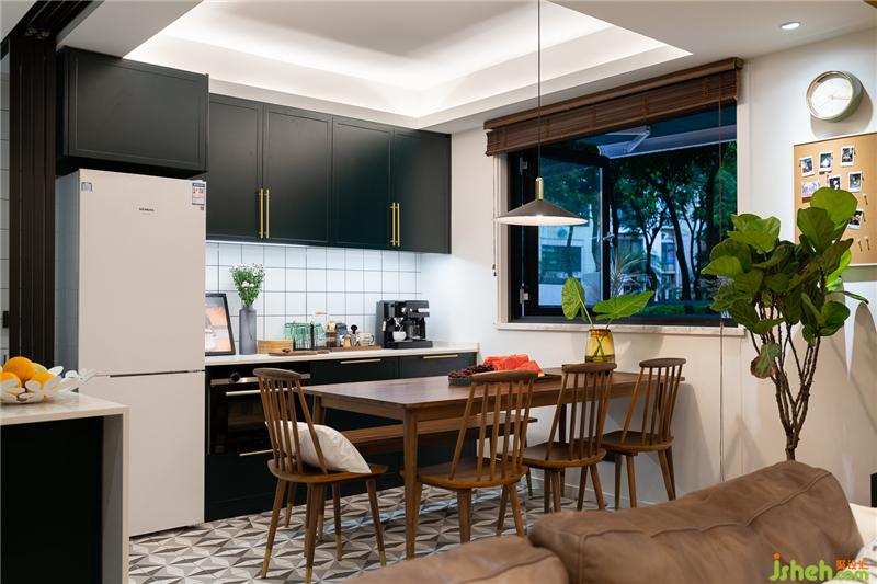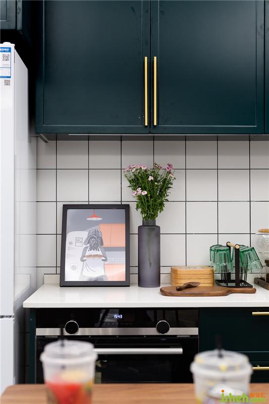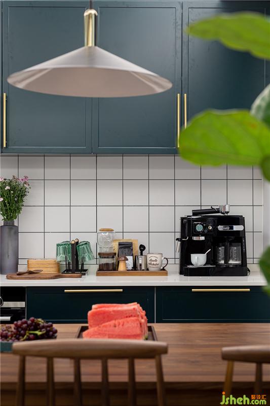 長(zhǎng)凳后方定制了墨綠色壁柜,補(bǔ)充廚房的收納空間,臺(tái)面放置了屋主心心念念的咖啡機(jī)。周末早晨,坐在這里來(lái)杯morning coffee,欣賞著窗外的晨光,開啟元?dú)鉂M滿的一天~