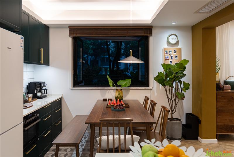實(shí)木的大餐桌很符合整個(gè)空間的氣質(zhì),由于面積有限,采用了餐椅+窄邊長(zhǎng)凳,坐在長(zhǎng)凳上轉(zhuǎn)身就能拿到想要的東西。室內(nèi)設(shè)計(jì)師