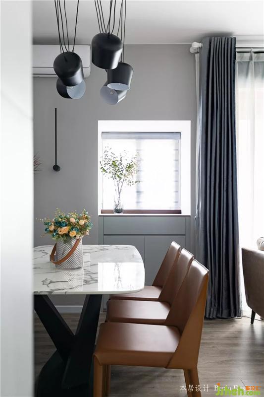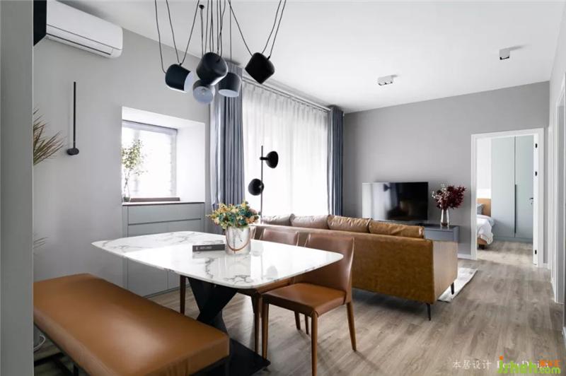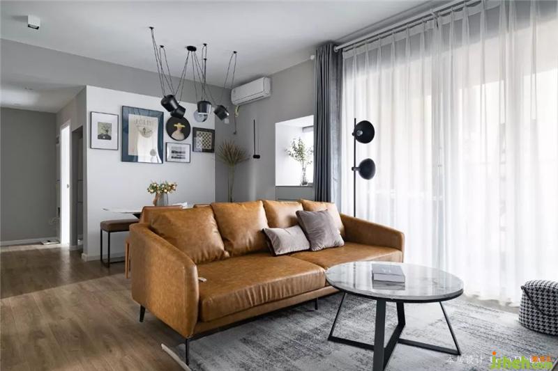 客廳整體是淺灰色系,選擇棕色皮質(zhì)的沙發(fā),以此為中心,打造一個小而精致的交流空間。在灰色調(diào)的墻面、窗簾與抱枕中,沙發(fā)顏色極具跳脫性,使整個空間更具立體感和層次性。室內(nèi)設(shè)計師