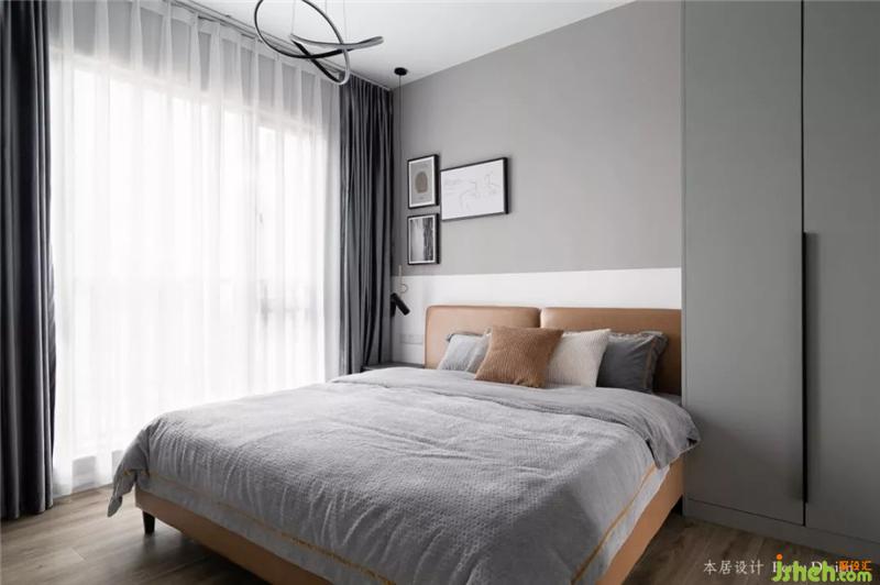 全屋延續(xù)淺灰調(diào)+棕色的配色,棕色床體+灰色柜體+灰色窗簾現(xiàn)代意式風(fēng)格,簡(jiǎn)約中透露著高級(jí)時(shí)尚感。室內(nèi)設(shè)計(jì)師