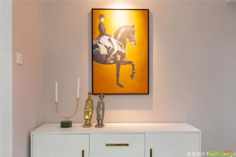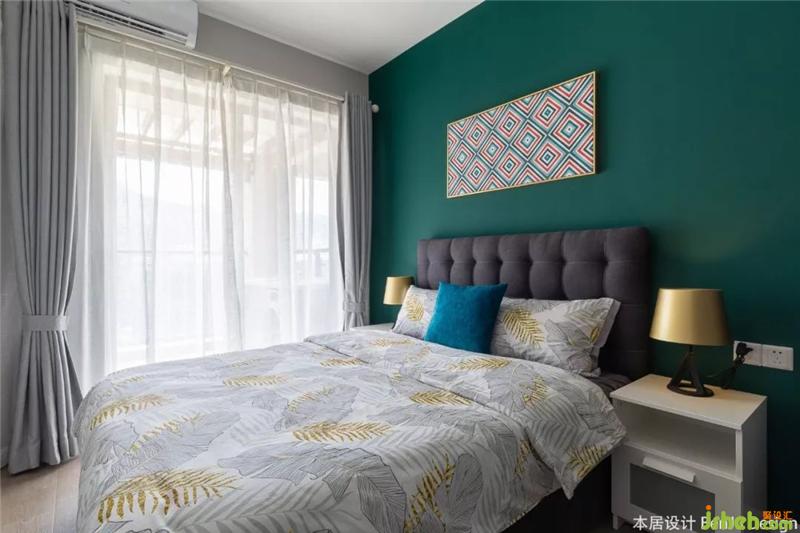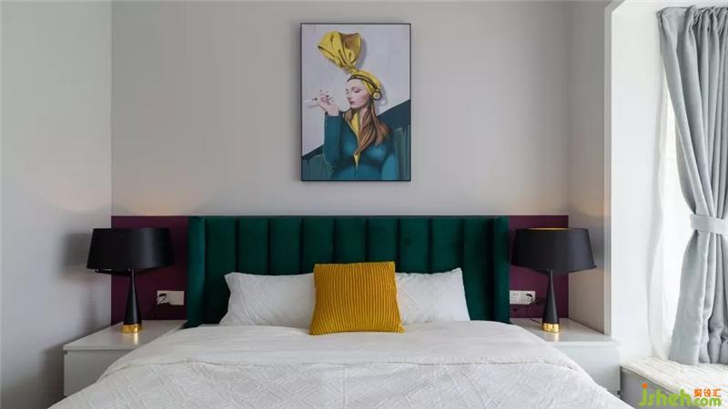 墨綠色的床頭,摩登的插畫,讓臥室的風格與客廳截然不同。
