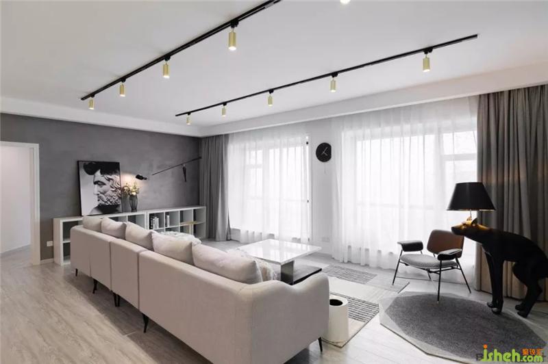 客廳整體以白色為基底,局部采用中性灰色水泥進(jìn)行搭配,黑色金屬的壁燈以點(diǎn)綴。為了視覺上的協(xié)調(diào),落地書柜配合沙發(fā)的高度,在沙發(fā)坐著就能找到自己要看的書。室內(nèi)設(shè)計(jì)師