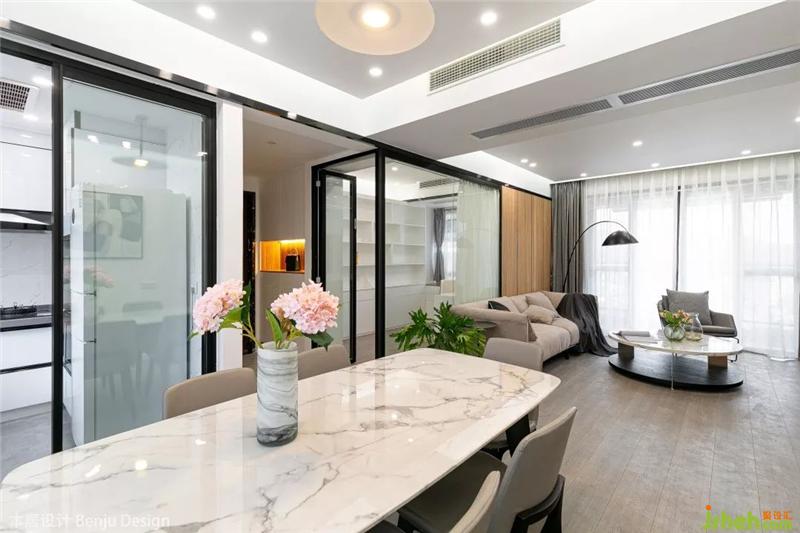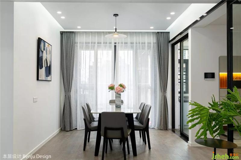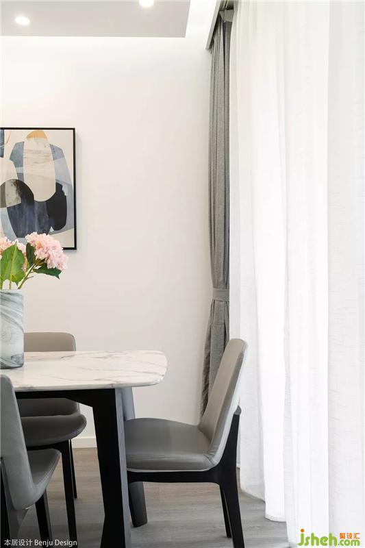 餐廳選用了一張白色大理石紋路的長方形餐桌,聽說女主人特別喜歡花藝,所以我們也在整個空間里放置了各種各樣的花瓶和綠植,讓她以后有更多自我發(fā)揮的空間啦。室內設計師