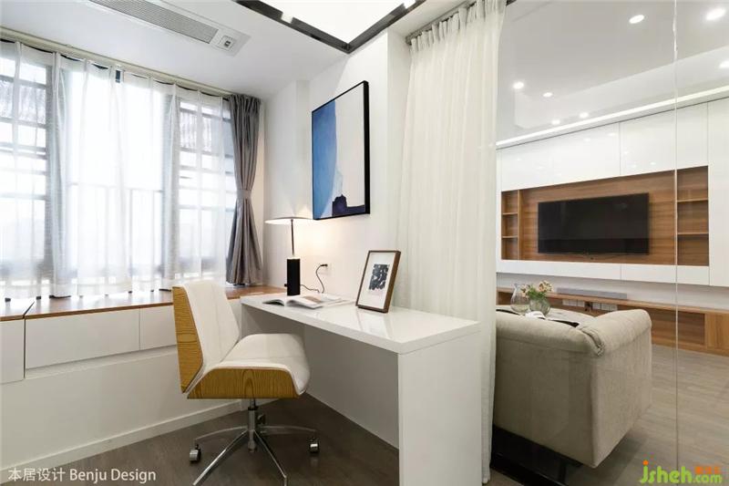 書房的墻體因為有一半是承重墻不能完全打開,所以包上木板加以裝飾,搭配上淺色系的沙發(fā),整體視覺效果還是非常和諧的。室內設計師