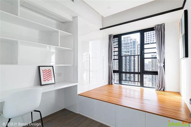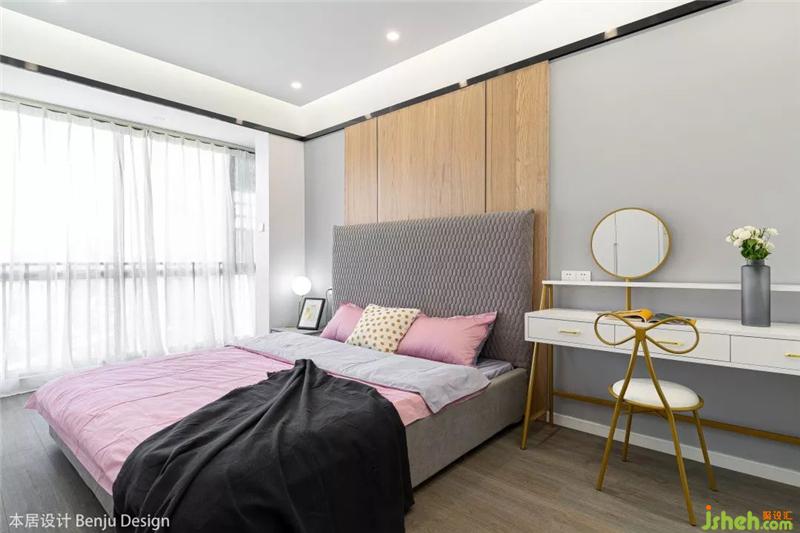 整個主臥的空間顯得非常的通透和明亮,擺放一張1.8m的大床后依然絲毫不覺得擁擠,床頭的背景墻設計沿用了客廳與書房隔墻的設計,保持統(tǒng)一的內外風格。右邊則直接用化妝臺代替了床頭柜,順便提一下,這個化妝椅的設計,簡直是一眼就擊中了老夫的少女心,果斷拿下。