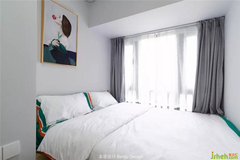 次臥床頭旁的墻向內(nèi)縮進(jìn),給主臥的衣柜騰出了空間。室內(nèi)設(shè)計(jì)師