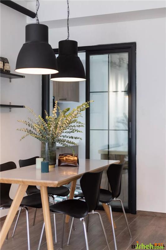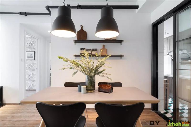 在客廳延伸到餐廳的墻面上,因為層高原因不想再加吊頂,所以我們干脆將無法隱藏的管線大大方方的外露出來,簡單的刷上黑漆,個性的工業(yè)風元素就被毫無違和感的加入了這個空間中。
