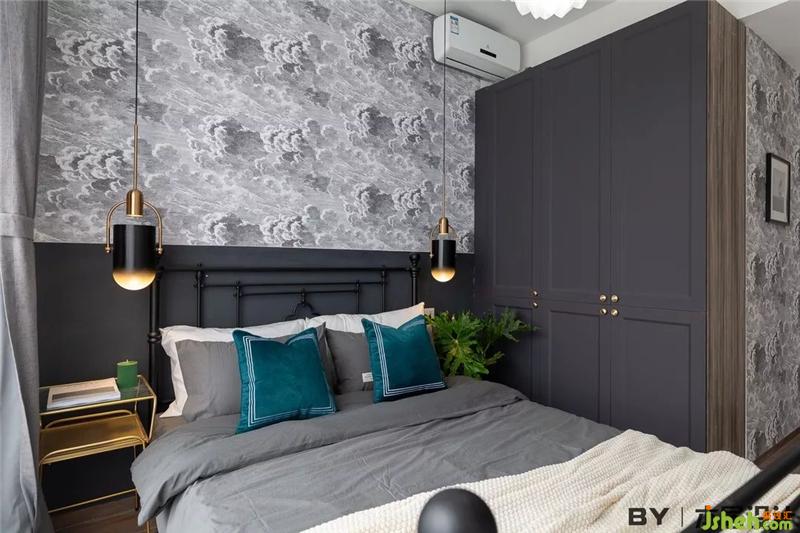 主臥的雙人床也是選擇了黑色鐵架的款式,床頭煙熏燈的效果簡直美到不行。在完成以前,我們曾經(jīng)也偷偷的懷疑過在主臥這么大面積的刷上黑色漆,是否會顯得壓抑。但整個項目完成后的效果簡直讓人驚嘆,墻面腰線以上的壁紙,非常大膽的選用灰色系烏云的圖案,和黑色的墻面相得益彰,藝術(shù)感和美貌并存。室內(nèi)設(shè)計師