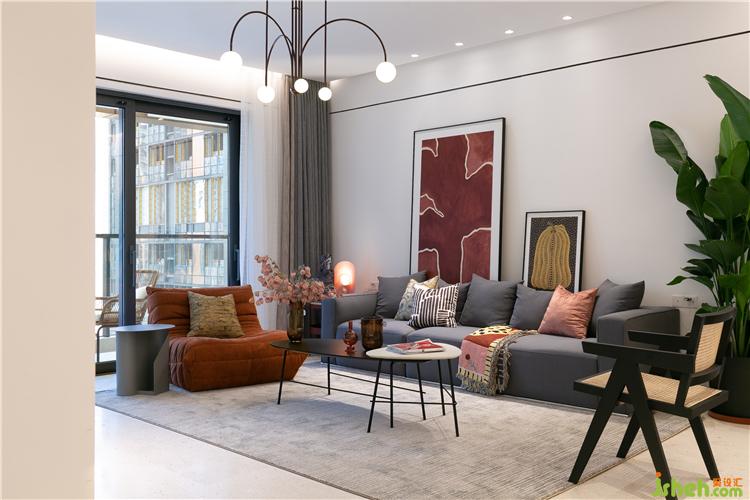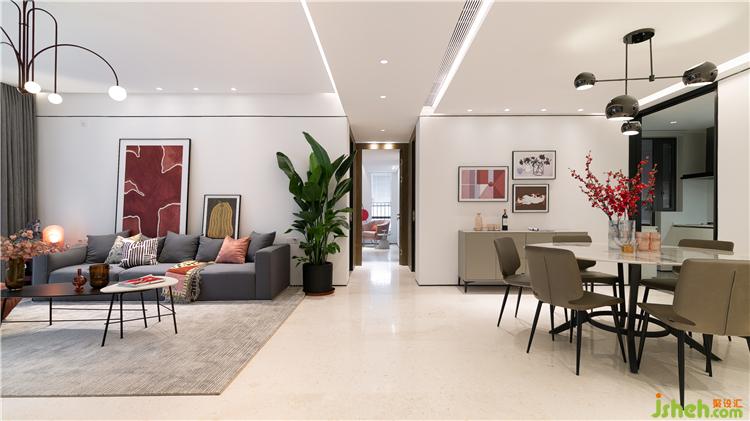客廳的整體色調(diào)以白色+灰色為主,誠然在華潤城黑白極簡的硬裝基礎(chǔ)上,室內(nèi)設(shè)計(jì)師需要為它注入鮮活的色彩,所以在空間中的軟飾,我們用了大量的紅色來點(diǎn)綴。在視覺焦點(diǎn)的沙發(fā)區(qū)域,用大幅的掛畫來營造視覺的沖擊感,以及塑造空間的藝術(shù)感。