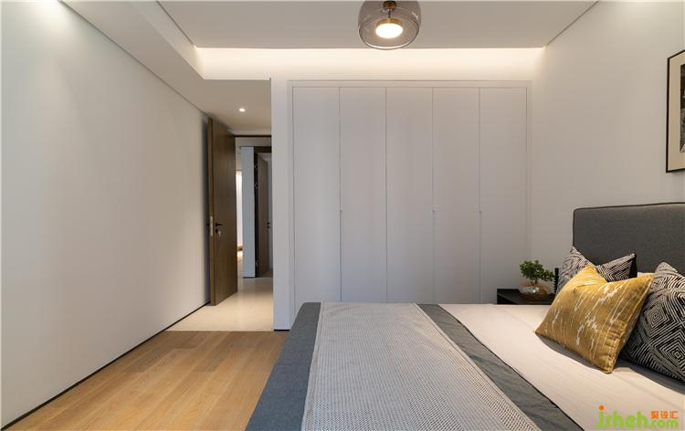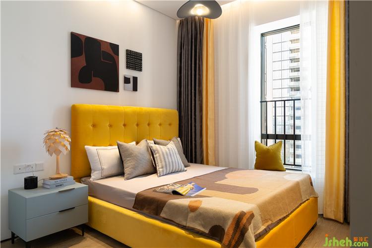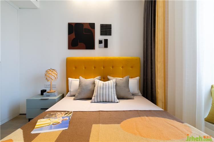 整體白色墻面和柜體,搭配深灰藍(lán)色的床品,經(jīng)典而通透的色調(diào)展現(xiàn)出一份優(yōu)雅與閑適。黃色抱枕,帶入一份溫馨,與藍(lán)白交疊出一份悠然與恣意。
