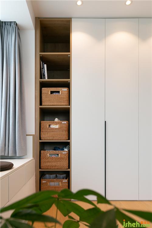 ▼被占用了一小部分空間的次臥,雖然面積不大,但溫馨感十足。和衣柜連接的開放格書柜,同樣是滿足“隨處可取書”的要求,而灰藍(lán)色床品與木色柜體的搭配,也更彰顯著成熟與穩(wěn)重。
