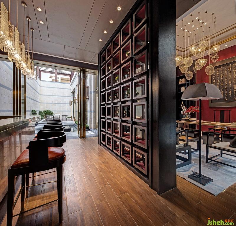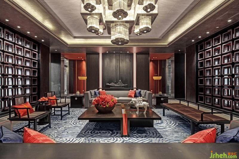 琉璃燈具上流動(dòng)的光影如粼粼水紋,蕩漾在天花,又折落到柔軟的地毯上,四方周正的空間中流淌著靈趣。遵循著古代禮制的家具成序擺放,古沉的灰調(diào)與木色上搭配正統(tǒng)的紅色與黛藍(lán),相得益彰,頗有大家風(fēng)范。
