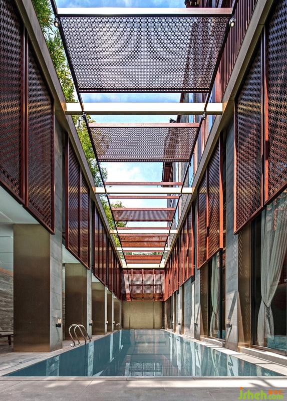 室外是斑彩熠熠的泳池,鏤空格柵天窗處理,使得光與影交錯(cuò)互映,在室內(nèi)外的交融對話中雕琢著一番生機(jī)豐沛的景象。