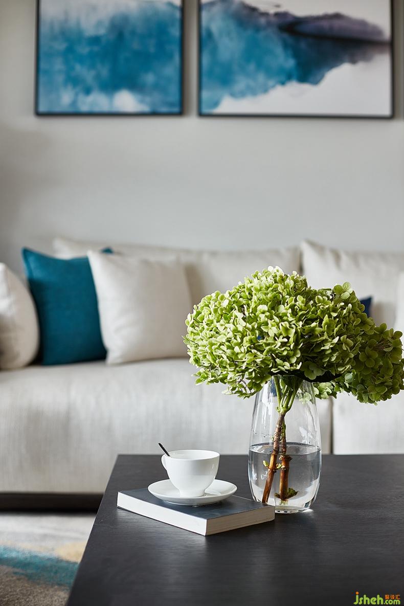 屋內(nèi)的一簇綠與屋外翠綠山景遙相呼應(yīng),自成一番頗有深意的意境之美。藍(lán)簾白紗、藍(lán)白腰枕與畫中水霧——藍(lán)與白為空間內(nèi)的一事一物錯落上色,輕松勾勒出空間的層次感。室內(nèi)設(shè)計(jì)師