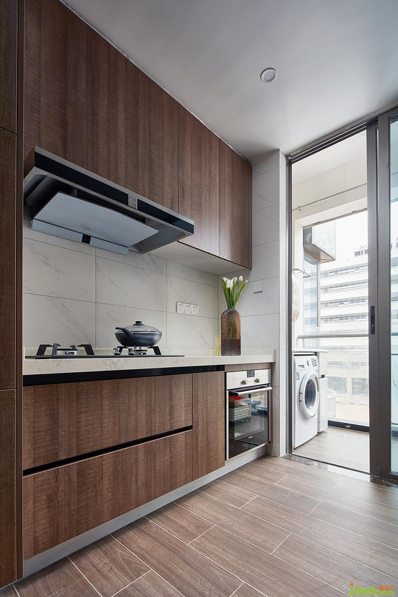 廚房選用一字型櫥柜,直線式的結(jié)構(gòu)簡單明了,為屋外光線“讓道”,使得室內(nèi)空間通透明亮。設(shè)計(jì)師為廚房預(yù)留出了足夠的活動空間,三兩人在廚房同時烹飪亦不會顯得擁擠。室內(nèi)設(shè)計(jì)師