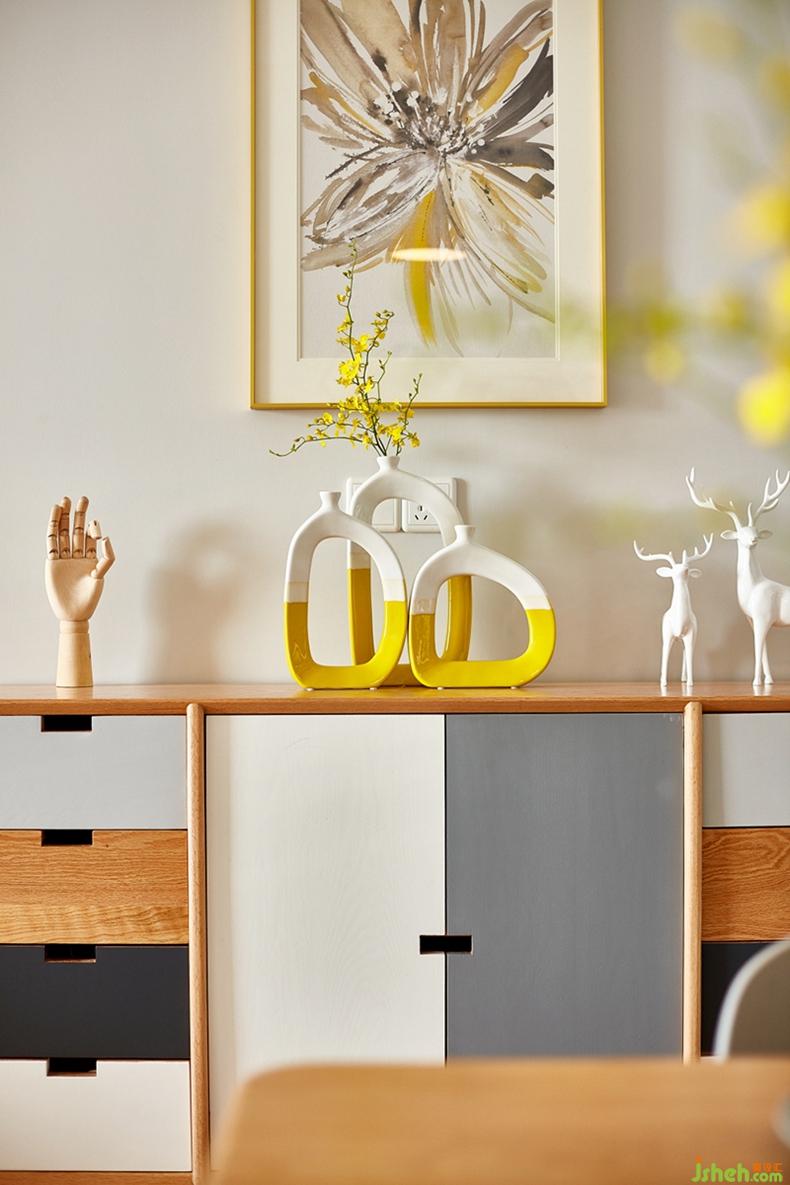 餐廳兩側(cè)設計了收納功能強大的邊柜,配以同風格的掛畫,一面清新,一面溫潤,不同的色系調(diào)劑著主人公的生活溫度。