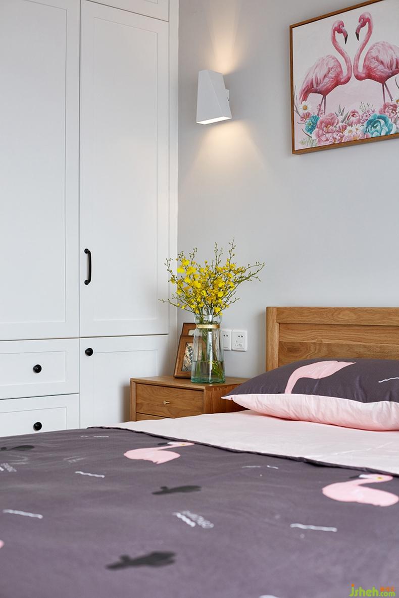 主臥:原木色的舒適、淺粉色的細(xì)膩與粉綠色的清新,搭配調(diào)和著給主臥染上了一抹治愈感?;鹆银B主題的空間自帶浪漫氣息,讓整個(gè)主臥功能性與審美性兼具。