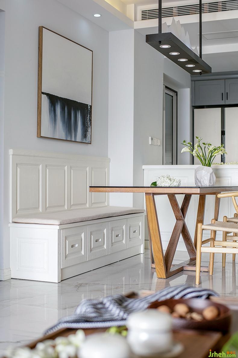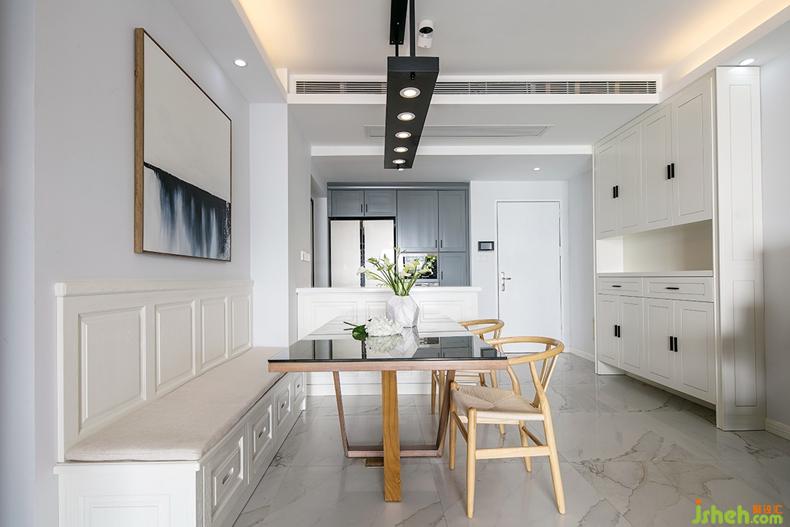 淡雅白的清爽打底與木質(zhì)線條的柔和點綴,讓餐廳的視覺空間顯得通透寬敞。入門右邊區(qū)域設計成廚房與外界空間的過度區(qū)——增加操作臺、定制收納柜,同時將冰箱外置,最大限度地分擔了廚房的功能職責。