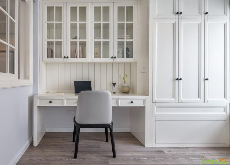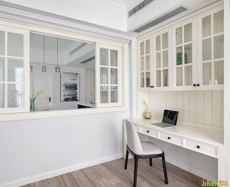 書房與餐廳隔窗相鄰互不干擾,米白色書柜可以容納書籍和各式小擺設(shè),簡潔雅致的書房氛圍,讓人在桌案前專心書寫、工作、閱讀。