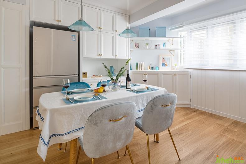 室內(nèi)設(shè)計(jì)師把陽(yáng)臺(tái)封窗做成書(shū)桌,擴(kuò)延到餐廳,使餐廳整體面積變大。玻藍(lán)餐燈與銀灰餐椅相映,在米白色柜櫥的背景下給人的感覺(jué)是明亮又有色彩感的。