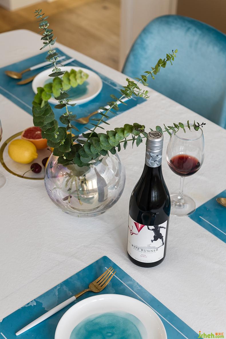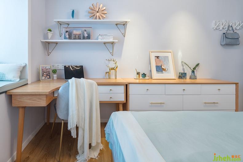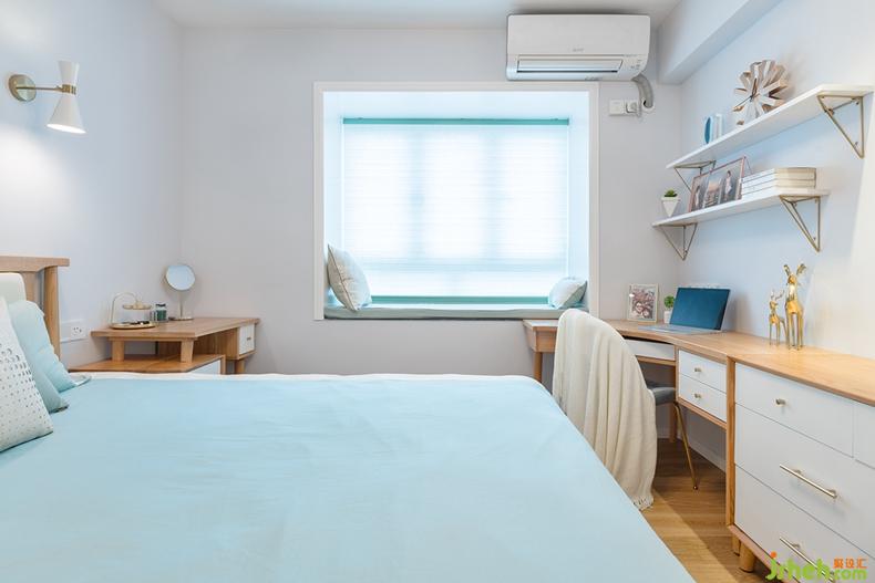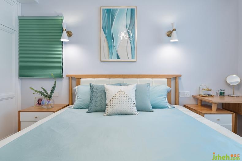 玻藍(lán)色的床品與窗簾、裝飾畫的顏色融為一體,這一抹純凈的藍(lán)為臥室披上一層溫暖繾綣的外衣,實(shí)木的肌理,內(nèi)斂的祖母綠,流露著臥室的靜。