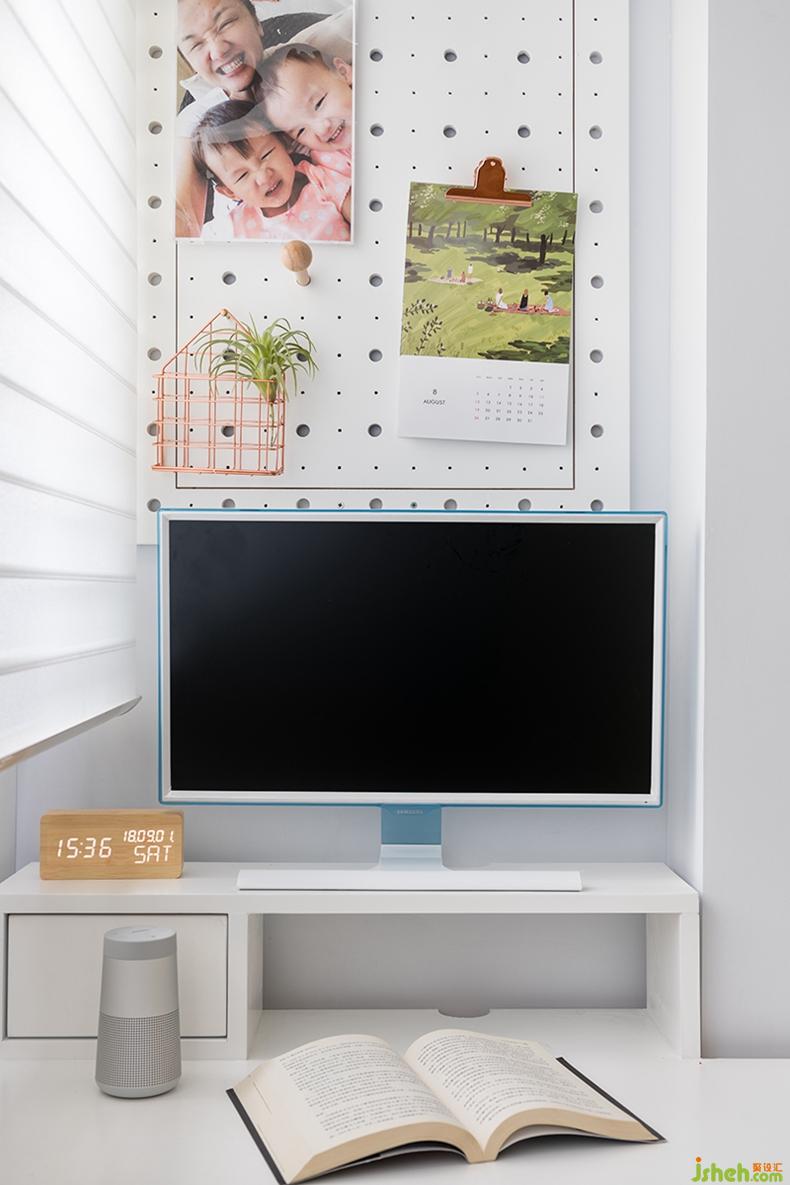 書桌與餐廳相鄰互不干擾,大面積白色帶來明澈柔和的感受。書柜充分發(fā)揮收納實(shí)用功能,填滿主人與雙胞胎女兒的幸福生活軌跡。