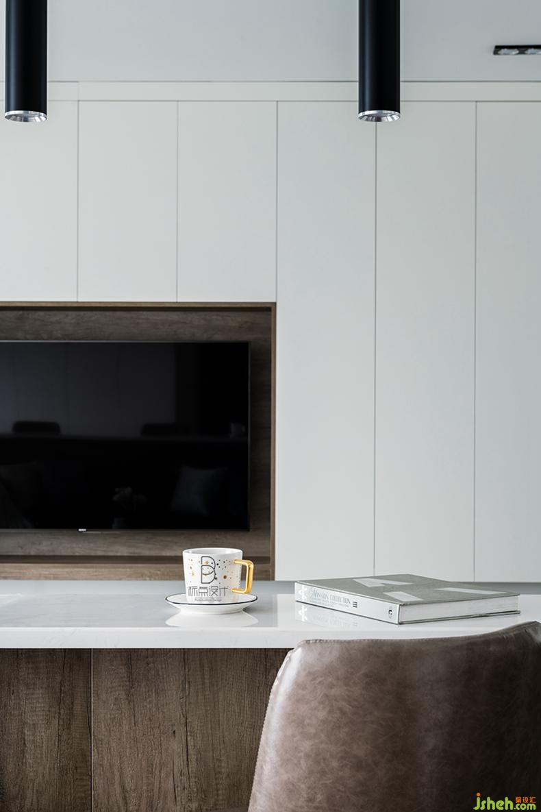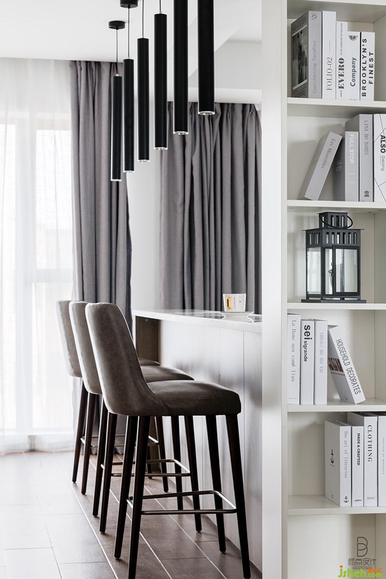在客廳沙發(fā)背后,吧臺圍合出的小塊區(qū)域,適合朋友們坐下來聊天、閱讀,配合藝術(shù)感極強的燈具和柜子上的書籍,烘托出聚會的氣氛。室內(nèi)設(shè)計師休閑區(qū)既有效地劃分了門廳與客廳的功能區(qū)域,又延伸了視覺效果,可謂是一舉兩得。