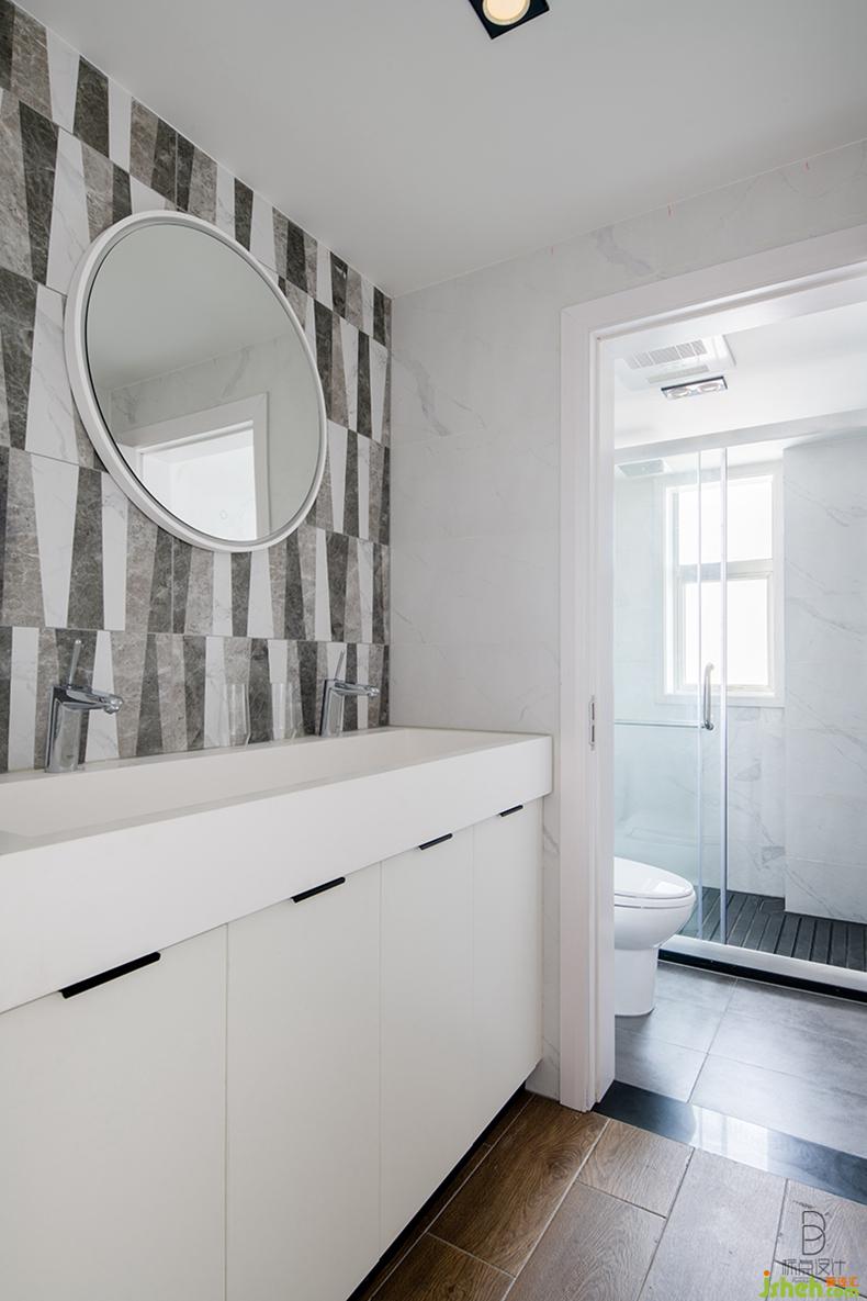 色彩鮮明的幾何形墻面磚如拼圖般層層鑲嵌,讓小小的空間顯得更為鮮活有趣。