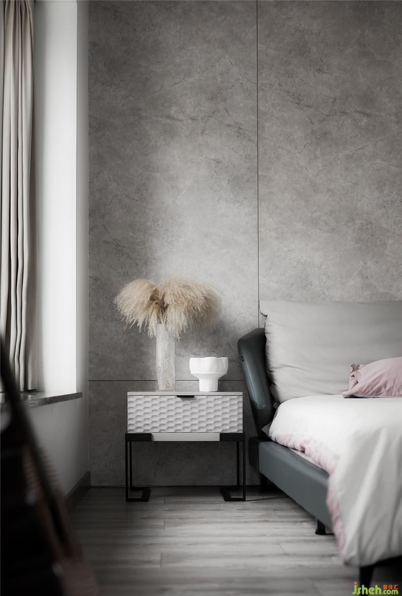 床頭背景我們選擇了一款仿石紋的愛(ài)格板做為裝飾。