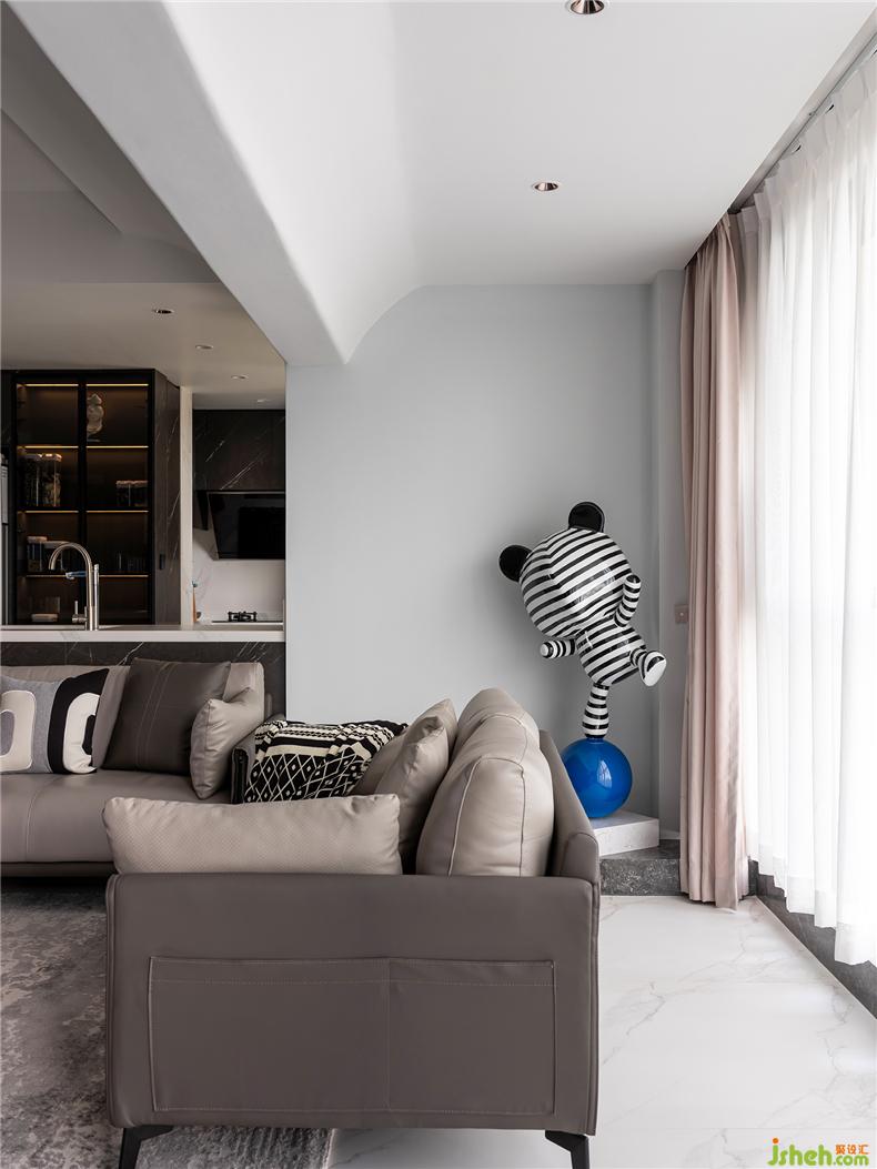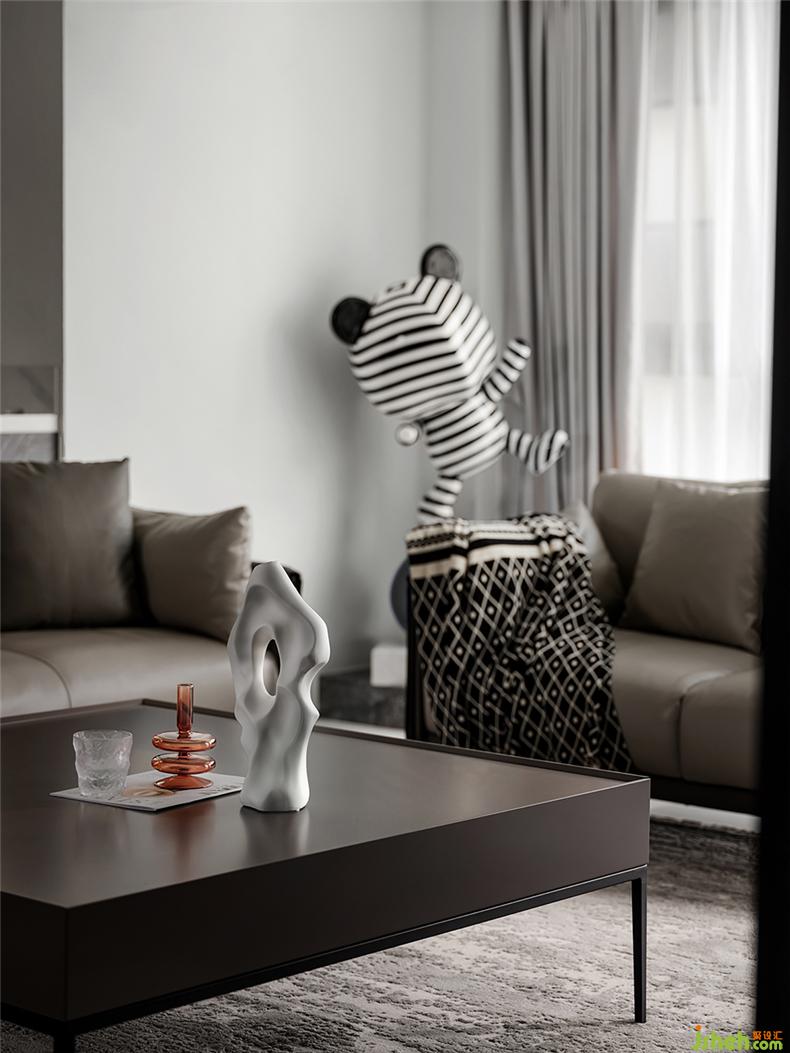 條紋熊、灰色地毯、藝術(shù)雕塑與器物……在通透的氛圍里,將穩(wěn)重與靈動同時呈現(xiàn),演繹功能、室內(nèi)設(shè)計師視覺、品質(zhì)及設(shè)計概念的四種維度