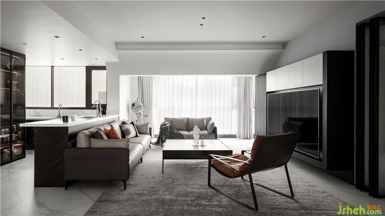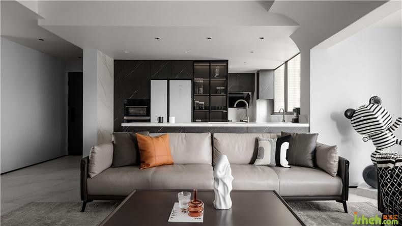 因為基于現(xiàn)代敞朗的格局形態(tài),軟裝的介入更偏向居者本身的性格和心理感受,整體簡約舒適,色彩也更顯俊酷,細(xì)節(jié)處則是側(cè)重時尚、個性,點綴的幾筆橙色,已足以溫暖