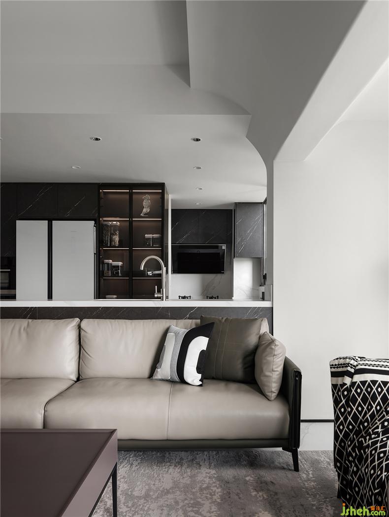 與客廳并列于縱線的島臺、開放式廚房,以大理石臺面預(yù)示功能區(qū)的轉(zhuǎn)換,突出的黑色玻璃柜體不僅實用,對應(yīng)著電視背景墻,為生活注入更多光景和滋味,自然地接納所有平淡或愜意的日子