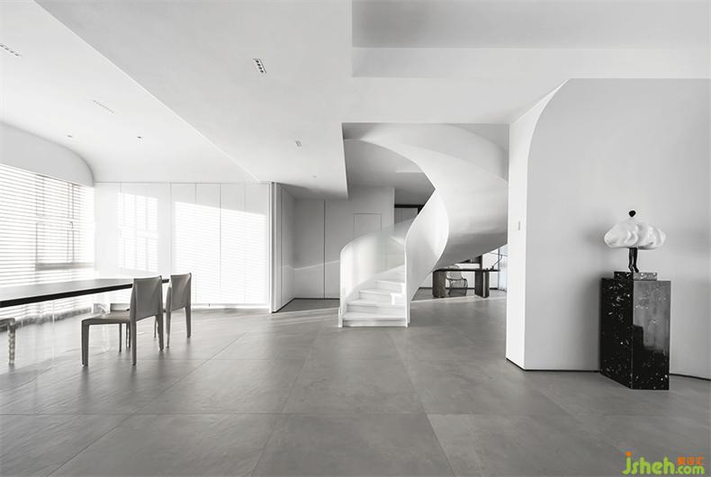 客廳、餐廳、廚房、書房,完全開放;三張簡單的桌子、一套舒適的沙發(fā)、室內(nèi)設(shè)計師幾筆弧線、一系灰色,奠定空間的純粹,無需彰示什么,生活就在那里,以腳步起點,光為色彩,隨心所動,繪出身體與精神上需要的所有。