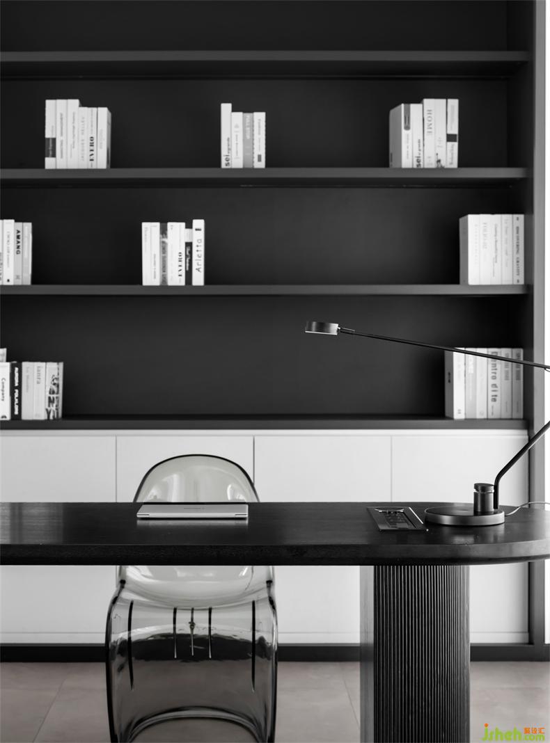 書房主調(diào)滲入了黑色,讓兩種極端的色彩糅合,標(biāo)識區(qū)域的特殊性,增加沉穩(wěn)的理智感,又簡練大氣,不會打擾思考,或者創(chuàng)作時的氛圍。