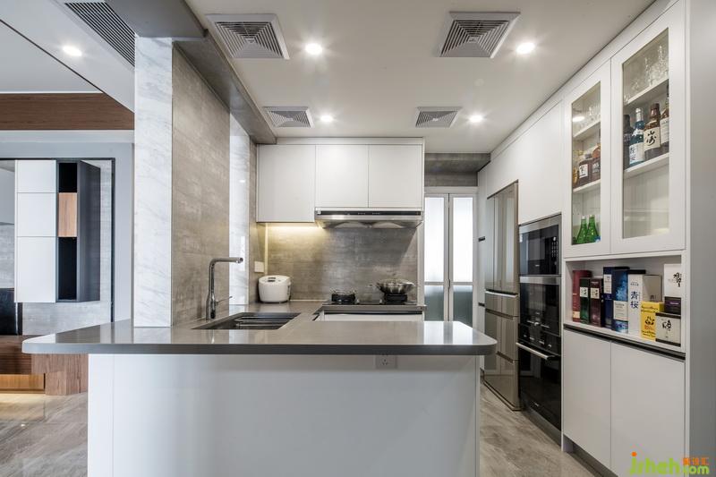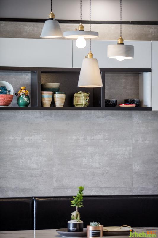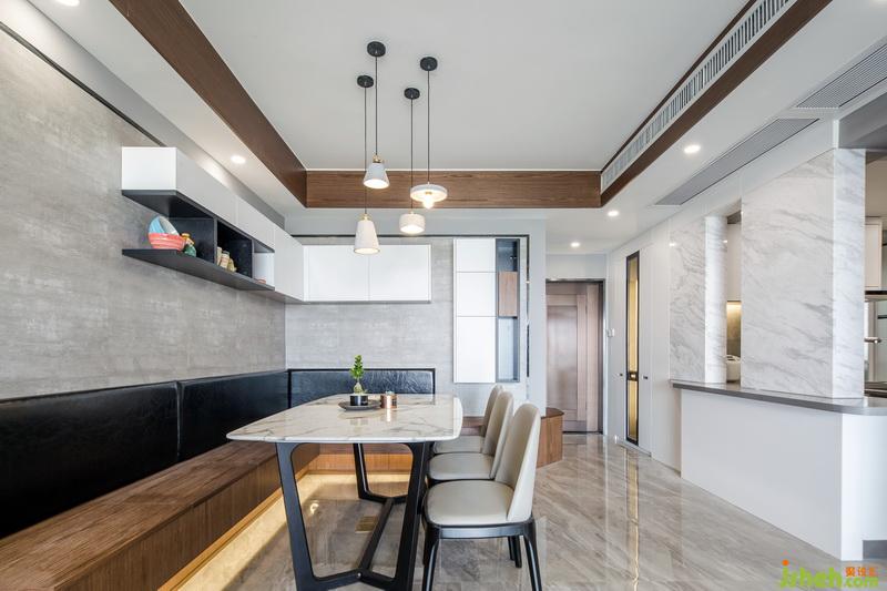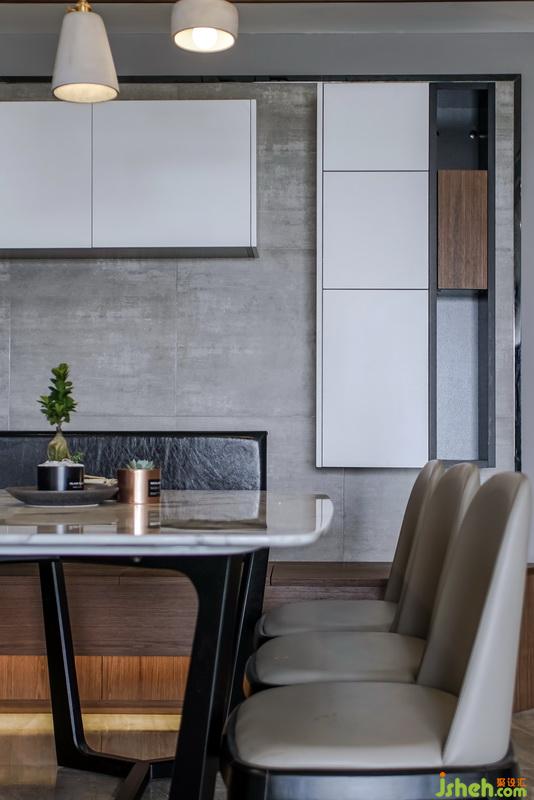 在空間立面設(shè)計(jì)上,造型做到一減再減的設(shè)計(jì)手法,讓空間變大,家具盡量使用實(shí)木家具以保證綠色環(huán)保,電視墻面是滿墻的柜體,卻并沒(méi)有造成視覺(jué)的擁堵,因?yàn)榕c櫥柜的臺(tái)面處理成同一面,巧妙的弱化了存在感,色彩上采用大面積色塊,灰色配合了高質(zhì)感的家具材質(zhì),燈光使用暖黃光,符合業(yè)主的品味也不失一家四口的和諧溫馨。